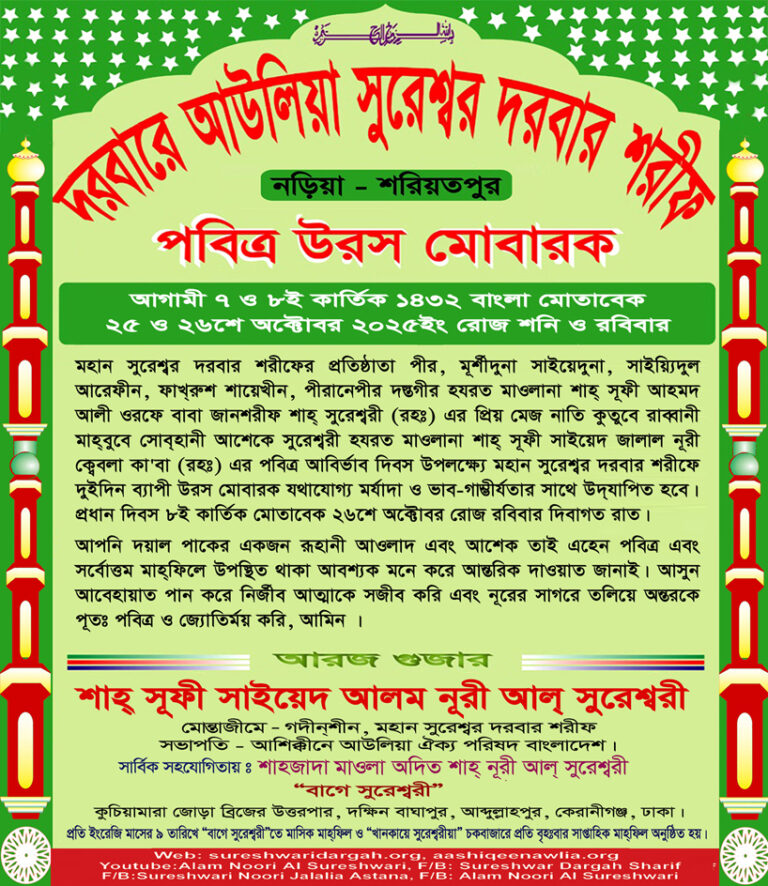 মাহতারাম আসসালামু আলাইকুম ওয়া রাহমাতুল্লাহি ওয়া বারাকাতুহু । অগণিত হামদ এবং শোকরানা সেজদা পেশ করছি আল্লাহ্ রাব্বোল এজ্জতের বারেগাহে, অগণিত ছালাত ও ছালামের নযরানা নিবেদন করছি ছরওয়ারে দো’আলম নবীয়ে দোজাহাঁ হযরত মোহাম্মাদুর রাছুলোল্লাহ্ ছাল্লালাহু আলাইহে ওয়া ছাল্লামের নূরোন আলা-নূর কদমপাকে, অসংখ্য দরূদ, ফাতেহা ও এখলাছ এর নযরানা নিবেদন করছি হযরত শাহানশাহে ত্বরিকৎ কোতবোল এরশাদ ছোলতানোল আউলিয়া মাওহেদীন ওয়াল কামেলীন ও আশেকীন হযরত মাওলানা শাহ্ সূফী আহম্মদ আলী জানশরীফ শাহ্ বাবা সুরেশ্বরী (রঃ) এর খেদমতে। আমাদের ক্বেবলায়ে দিল, ক্বাবায়ে জান, মোর্শেদে বরহক্ মাওলানা শাহ্ সূফী বাবা জালাল নূরী ক্বেবলায়ে ক্বাবা (রঃ) এর নূরী পাক চরণে অগণিত ছালাম, দরূদ ও ফাতেহার নযরানার সাথে ভক্তি নিবেদন করছি তাঁর অফুরন্ত এনায়েতের জন্য।